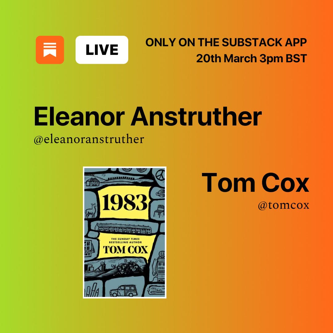 Re-entry, as Deirdre said yesterday, is difficult. But before I get into that, a little publicity for a LIVE chat I’ll be having with Tom Cox tomorrow. Thursday 20th March 3pm BST Tom and I will be in conversation, chewing the fat on books, publishing, Substack and whatever else springs to mind. Keep an eye on Notes for when we go live, and join us. Questions welcome! We’ll try and keep half an eye on the comments (hashtag multitasking writers R Us) ….