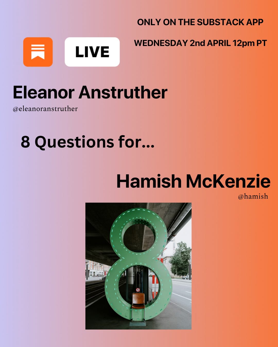 Yup, it’s happening. Today 12pm PT, that’s 8pm BST Hamish McKenzie and I will be grabbing an hour on the Substack App for 8Q LIVE. It’s the first of its kind, and what a guest to kick off with. It just goes to show, if you don’t ask….