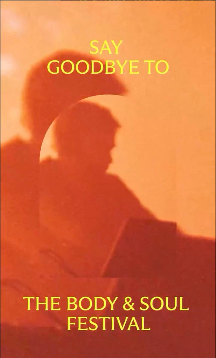 Did I mention I danced? A wake for a festival born 15 years ago in Ireland but conceived many years before at The Big Chill where my friend was given a corner to create something epic and so she did. It got so full of punters longing for a lie down in the arms of artists that security tried to lock the gates. But still they climbed over. We had the best music, the best installations and the best treatments. Body&Soul grew into its own Irish person, from small to Nick Cave and a crowd of 15,000. Through rain and sorrow and wild and covid she never stopped moving till last year, when she died - not that they knew it till after - and last night at her funeral weekend when at the Birdcage, coated in dust, the music was finally switched off.